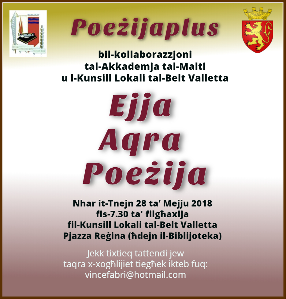 Uncategorized Posted on 23/05/2018 by L-Akkademja tal-Malti Reading time less than 1 minute Mexxiha: Click to share on X (Opens in new window) X Click to share on Facebook (Opens in new window) Facebook Like Loading... Related