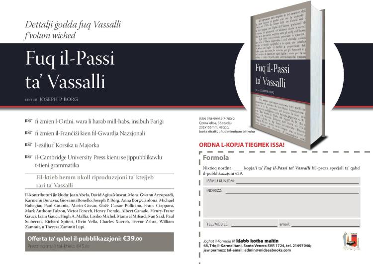 Fuq il-Passi ta’ Vassalli huwa pubblikazzjoni tal-Klabb Kotba Maltin u qed jinbiegħ bil-prezz speċjali ta’ €39 għal dawk li jabbonaw minn issa. Il-prezz tal-ktieb fil-ħwienet se jkun €45