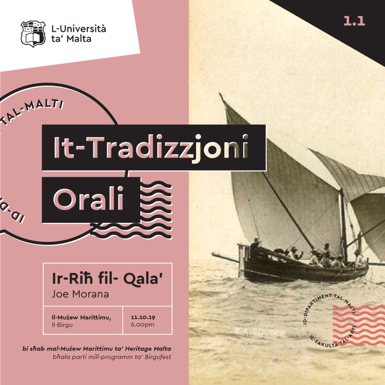 Nhar il-Ġimgħa 11 ta’ Ottubru 2019, fis-6.00pm, Joe Morana se jagħmel taħdita dwar “Ir-Riħ fil-Qala’,” fil-Mużew Marittimu, il-Birgu. Din it-taħdita mis-sensiela fuq It-Tradizzjoni Orali tad-Dipartiment tal-Malti tal-Università ta’ Malta se ssir bi sħab mal-Mużew Marittimu ta’ Heritage Malta u bħala parti mill-programm ta’ Birgufest. L-attività hija miftuħa għal kulħadd u d-dħul huwa b’xejn.