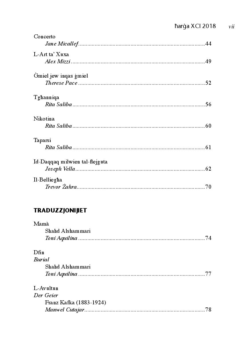 Imma varjata f’liema sens? Varjetà mhux biss ta’ kittieba, li jirrappreżentaw kemm il-ġenerazzjoni moderna bħal Ġorġ Borg, Victor Fenech, Charles Bezzina, Trevor Zahra u oħrajn, iżda wkoll hemm rappreżentanza tal-ġenerazzjoni kontemporanja bħal Claudia Gauci, Immanuel Mifsud, Rita Saliba, Paul Zahra u l-bqija. Hija varjetà li tindika wkoll għażla bejn kittieba maskili kif ukoll femminili. U la qiegħda nsemmi l-kittieba femminili, nixtieq nagħmel appell biex aktar kittieba nisa jinvolvu ruħhom u jipparteċipaw aktar billi jagħtu sehemhom f’rivisti letterarji lokali li mhux biss għandhom storja twila warajhom, iżda wkoll li maż-żmien kisbu ċertu kalibru.