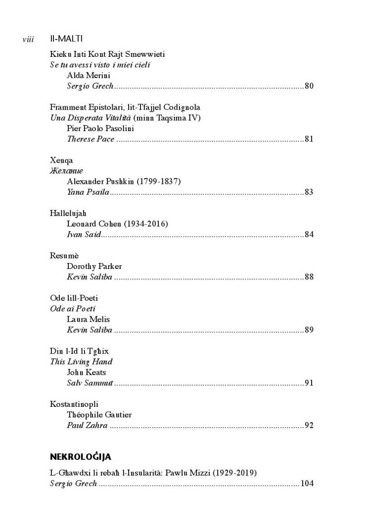Qiegħda nikteb dan l-editorjal b’ċerta diqa wara li ftit tal-jiem ilu tajna l-aħħar tislima f’din id-dinja lil Pawlu Mizzi – Missier il-Ktieb Malti. Ma nistax nagħlaq dan l-editorjal bla ma nagħti, f’isem il-bord editorjali kollu, il-kondoljanzi lill-familja Mizzi. Kienet tassew xierqa u f’waqtha d-dedika tal-aħħar ħarġa letterarja ta’ din ir-rivista lis-Sur Mizzi – ġest żgħir ta’ apprezzament għall-ġid kbir li għamel biex il-pubblikazzjonijiet bil-Malti laħqu l-livell li qed igawdu llum. Din il-ħarġa tinsab f’idejkom bis-saħħa tiegħu li għal dawn l-aħħar għoxrin sena ħa ħsieb il-pubblikazzjoni tagħha b’tant interess u mħabba lejn il-prodott letterarju lokali. Fi tmiem din il-ħarġa hemm in-nekroloġija miktuba minn Sergio Grech li tindika b’mod dettaljat il-ħidma kontinwa tas-Sur Mizzi f’dan il-qasam.
