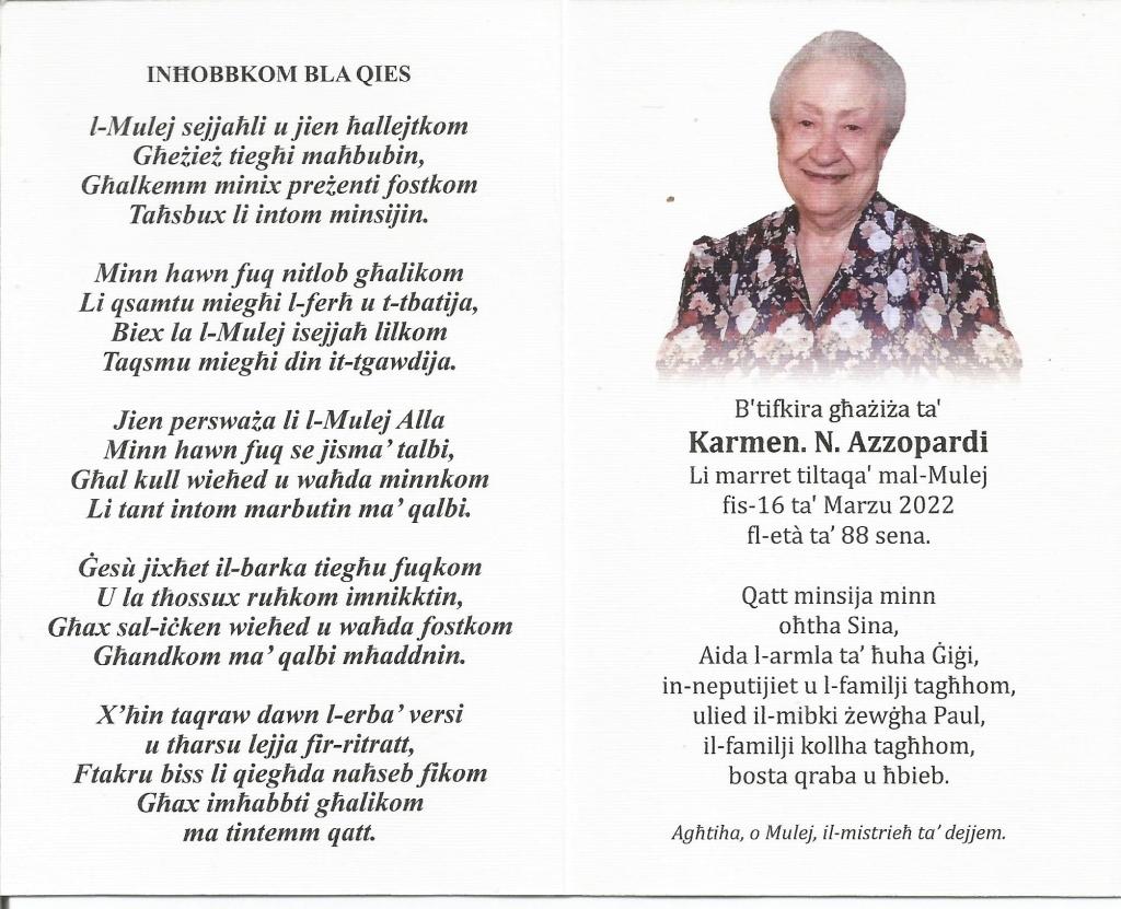 Tħabbret il-mewt tal-attriċi Karmen Azzopardi. Hija kellha 88 sena.