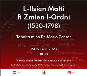 Heritage Malta u l-Akkademja tal-Malti jħeġġukom tattendu t-taħdita minn Dr Mario Cassar ‘L-Ilsien Malti fi Żmien l-Ordni (1530-1798)’, li se tittella’ fil-Mużew Nazzjonali tal-Arkeoloġija, il-Belt Valletta, nhar il-Ġimgħa, 24 ta’ Frar, fis-18:30 pm.