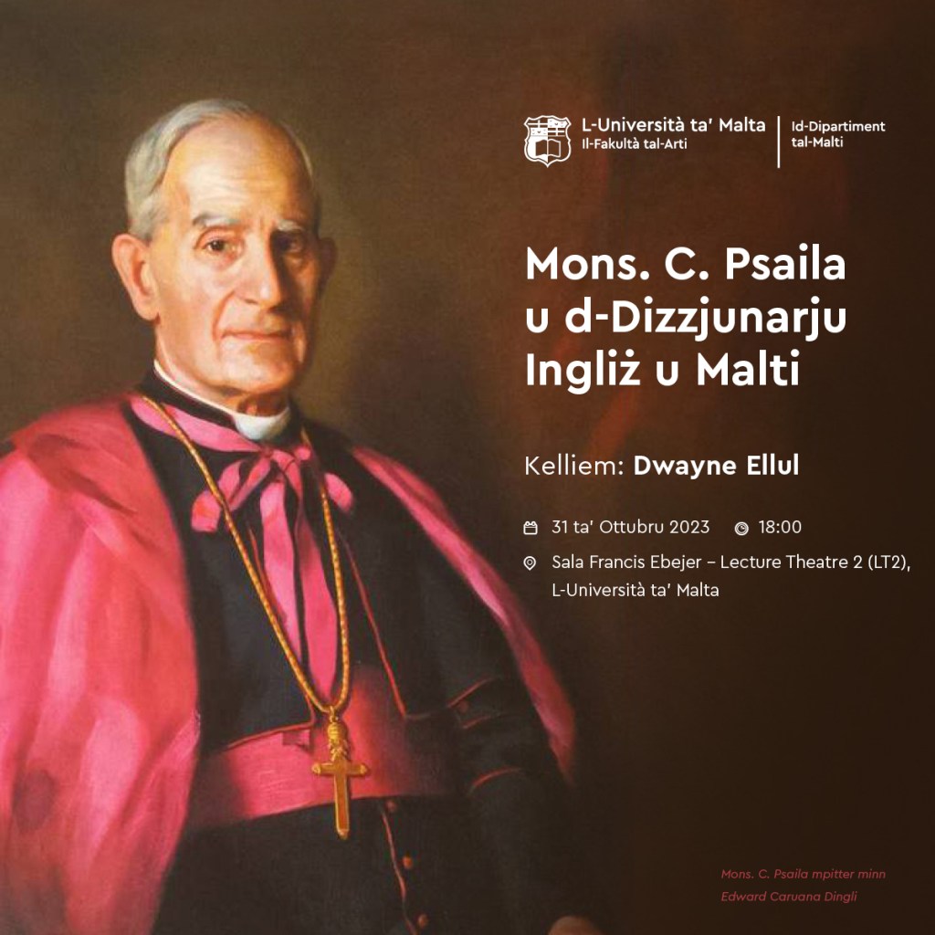 F’din it-taħdita Dwayne Ellul jitfa’ dawl fuq faċċata sikwit minsija mill-figura kumplessa ta’ Mons. C. Psaila: il-ħidma tiegħu fuq id-Dizzjunarju Ingliż u Malti, magħruf l-aktar bħala d-Dizzjunarju ta’ Dun Karm. It-taħdita se tiffoka fuq tliet oqsma ewlenin: 1. l-istorja tad-Dizzjunarju Ingliż u Malti 2. il-filosofija ta’ Psaila dwar il-lingwa u l-lessikografija 3. analiżi ta’ aspetti mid-Dizzjunarju li kienu nnutaw il-kritiċi.
