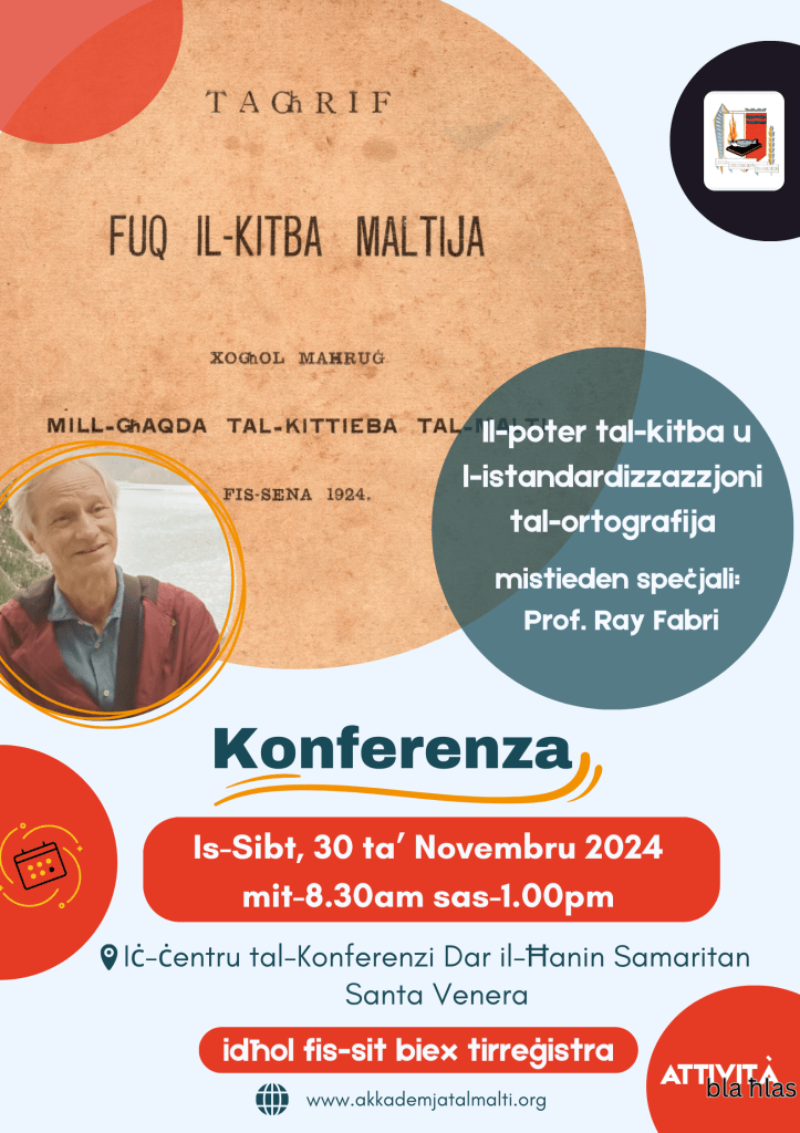 Diskors Il-poter tal-kitba u l-istandardizzazzjoni tal-ortografija – il-Konferenza 30/11 Posted on 08/11/2024 by L-Akkademja tal-Malti Reading time less than 1 minute Mexxiha: Click to share on X (Opens in new window) X Click to share on Facebook (Opens in new window) Facebook Like Loading... Related