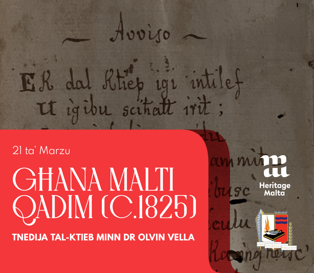 L-Akkademja tal-Malti u Heritage Malta jistednuk għat-tnedija ta’ Għana Malti Qadim (c.1825) ta’ Dr Olvin Vella f’serata li żżewweġ l-istorja tal-lingwa u l-melodija li se ssir nhar il-Ġimgħa 21 ta’ Marzu 2025 fil-Mużew Marittimu ta’ Malta, il-Birgu.