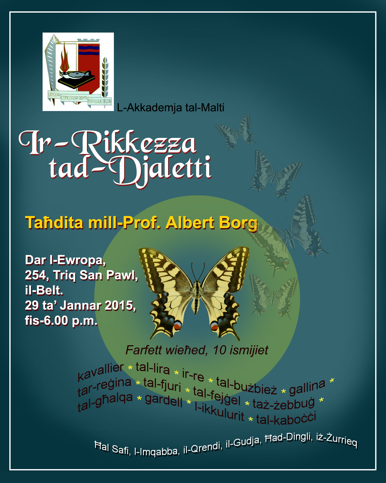 Nhar id-29 ta’ Jannar, 2015, f’Dar l-Ewropa, saret taħdita mill-Prof. Albert Borg dwar id-djalett.